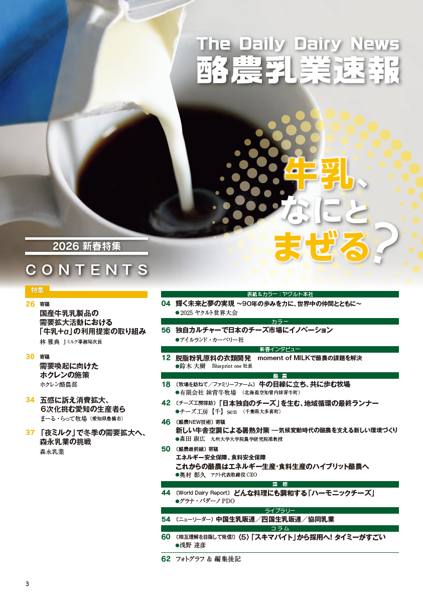 ◆「酪農乳業速報2026新春特集」を発行しました 2026/01/28 08:48 酪農乳業速報は1月23日付で「酪農乳業速報2026新春特集」を発行しました。目次は以下の通りです。刊行物のページから購入できます。