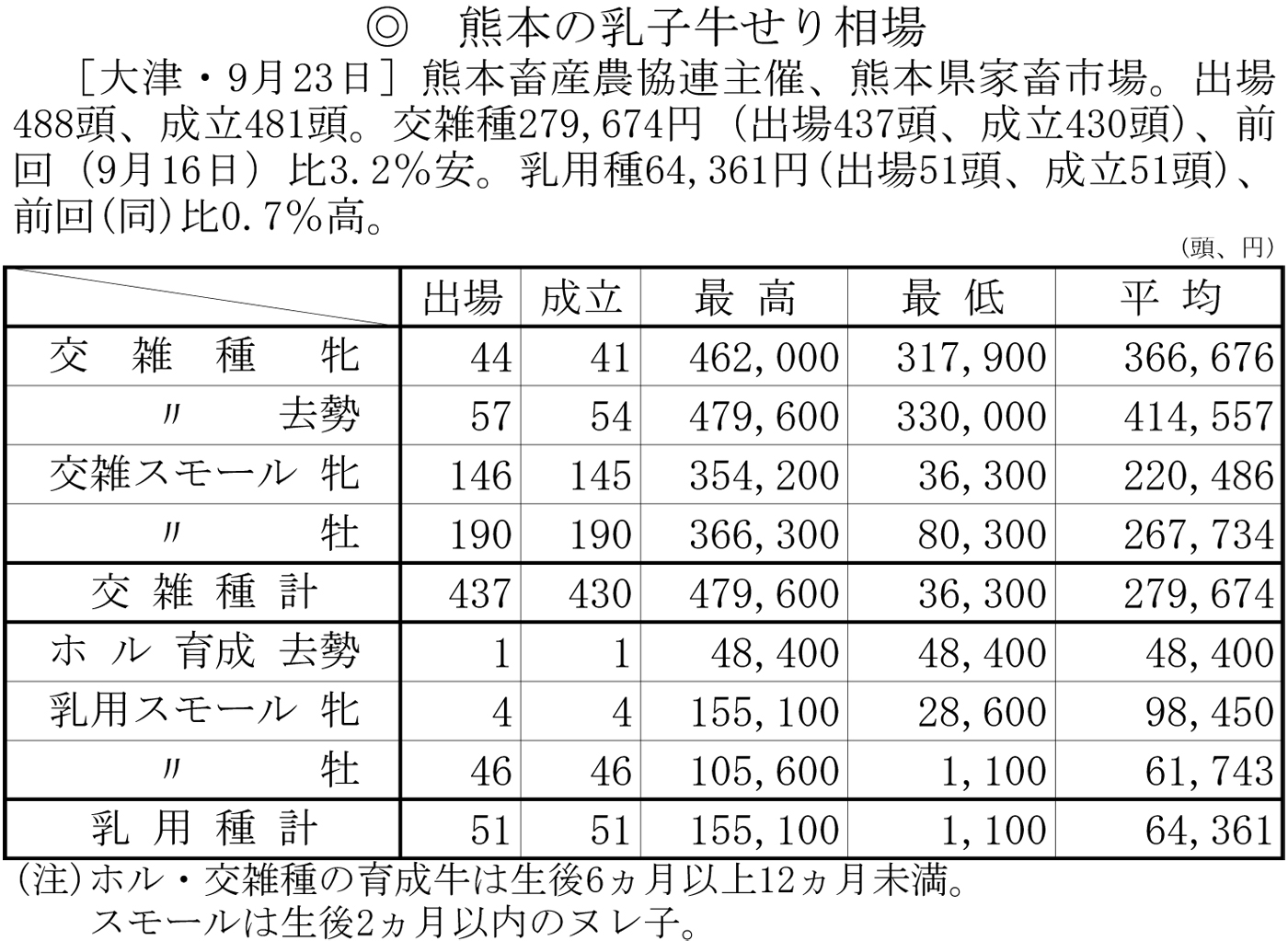 熊本の乳子牛せり相場(大津・9月23日)