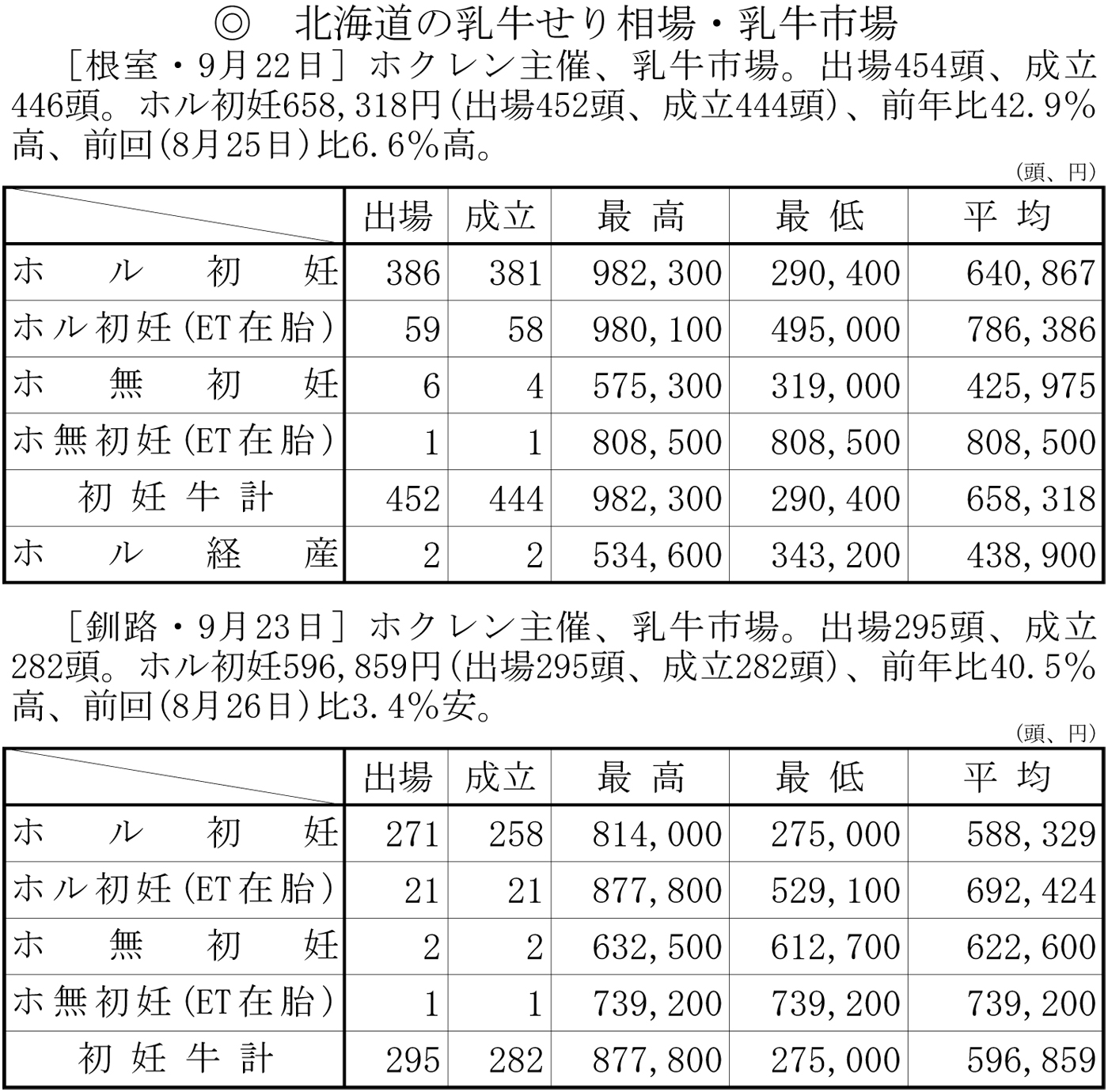 北海道の乳牛せり相場・乳牛市場(根室・9月22日、釧路・9月23日)