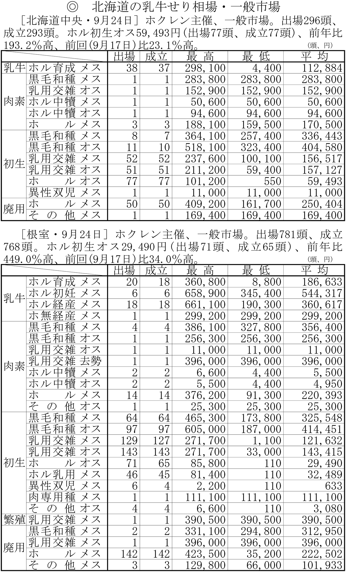北海道の乳牛せり相場・一般市場(北海道中央・9月24日、根室・9月24日)