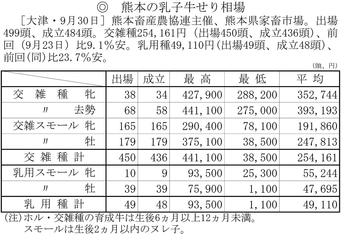 熊本の乳子牛せり相場(大津・9月30日)