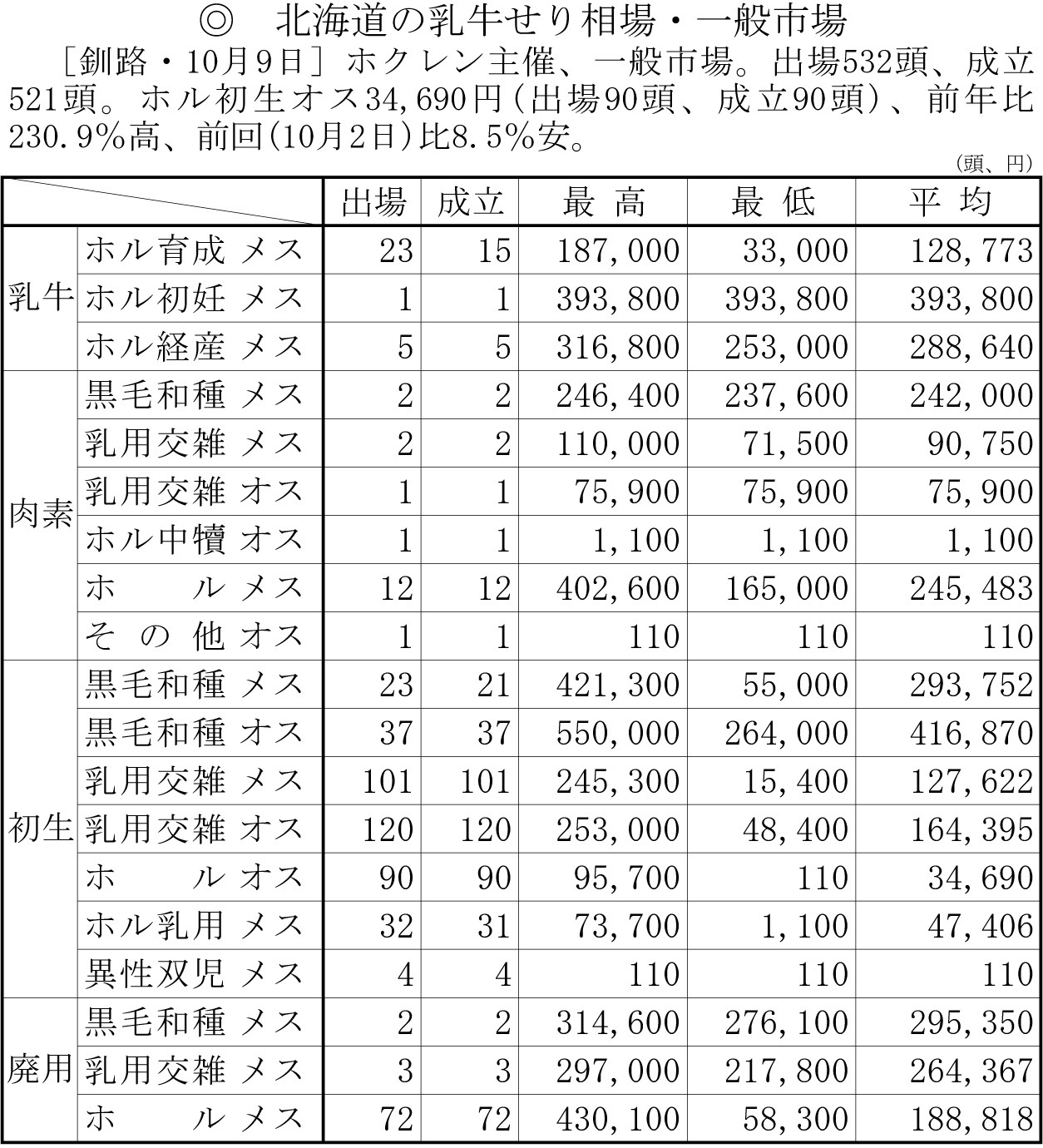 北海道の乳牛せり相場・一般市場(釧路・10月9日)