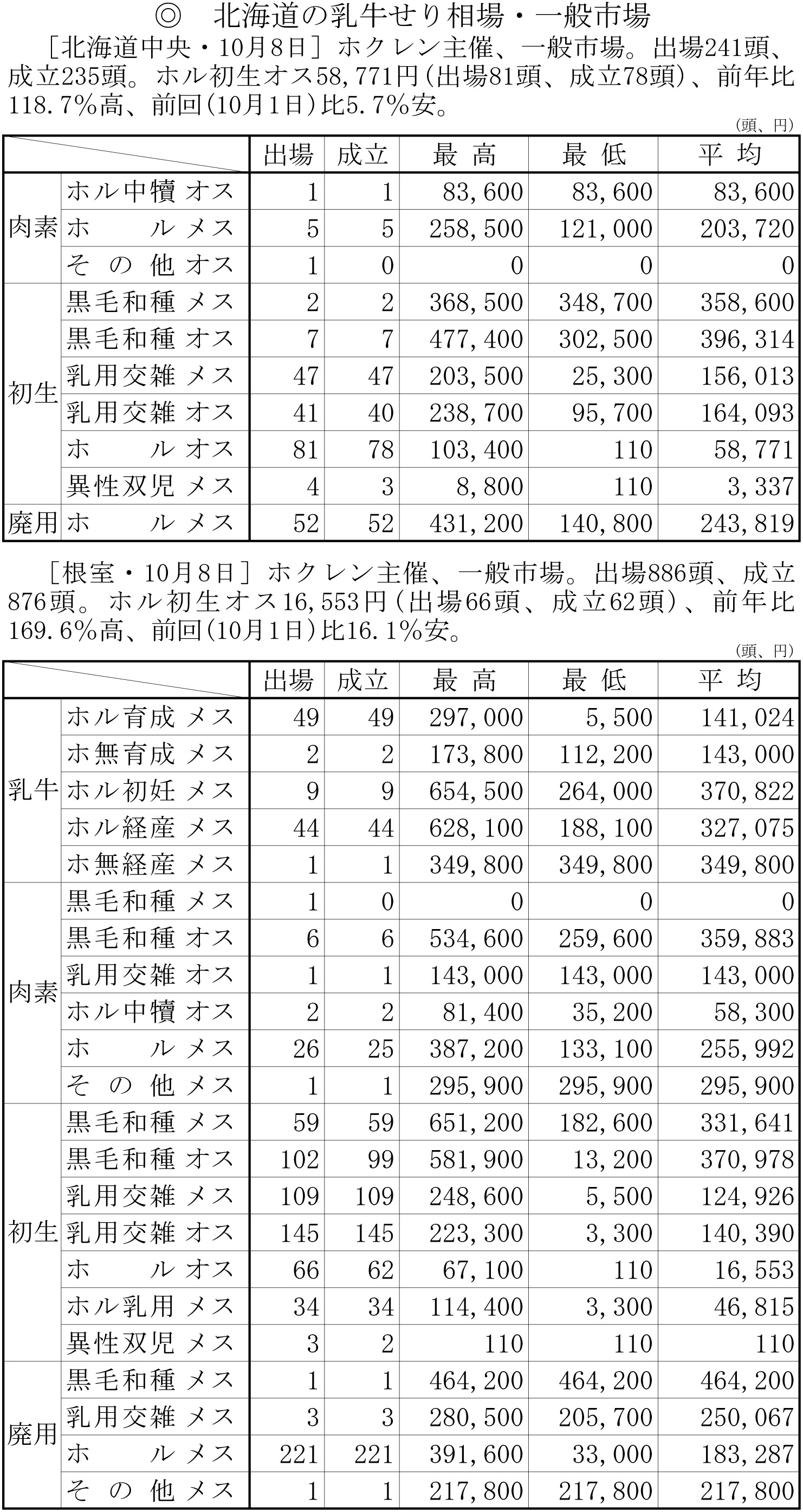 北海道の乳牛せり相場・一般市場(中央・10月8日、根室・10月8日)