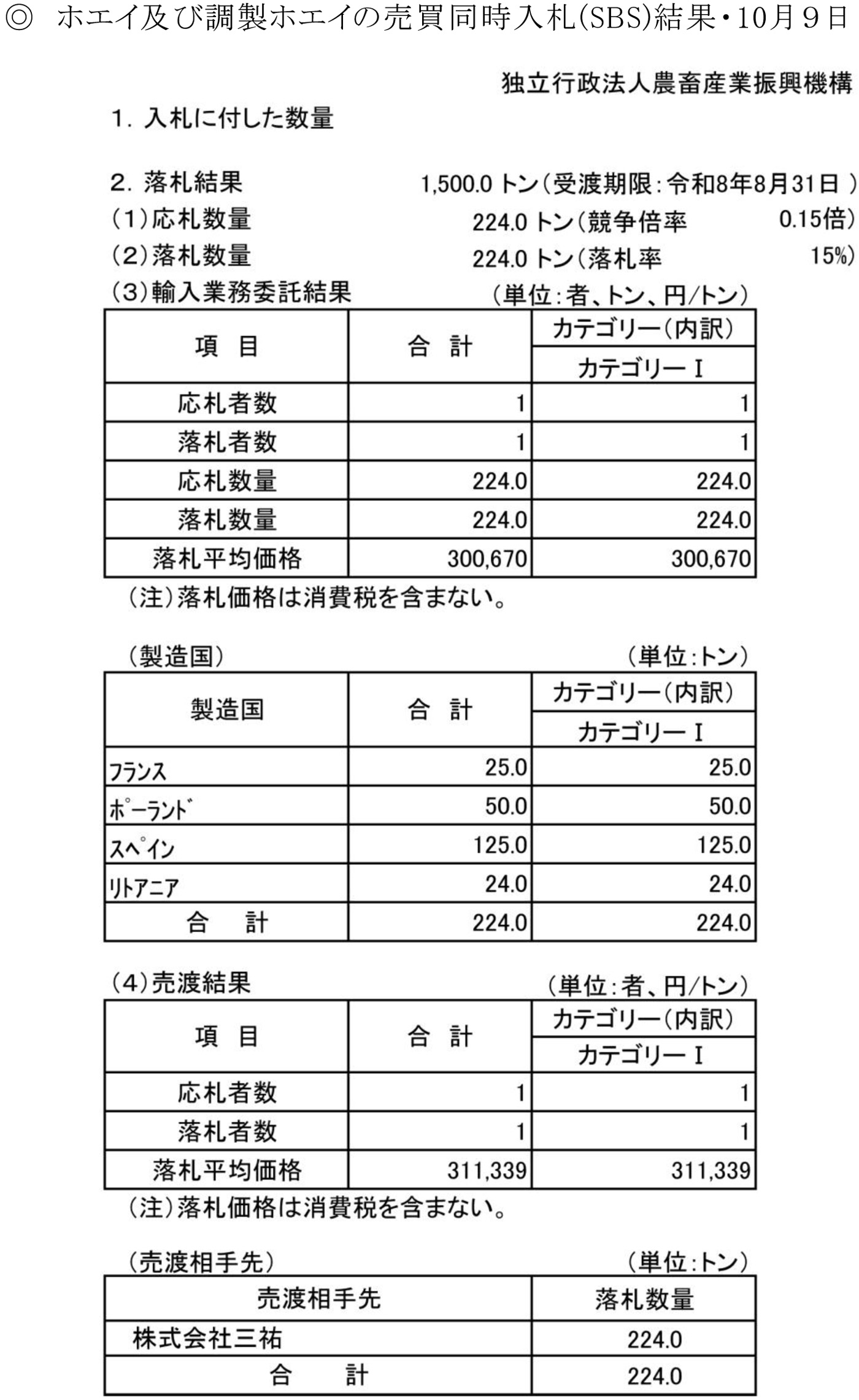 ホエイ及び調製ホエイの売買同時入札(SBS)結果・10月9日