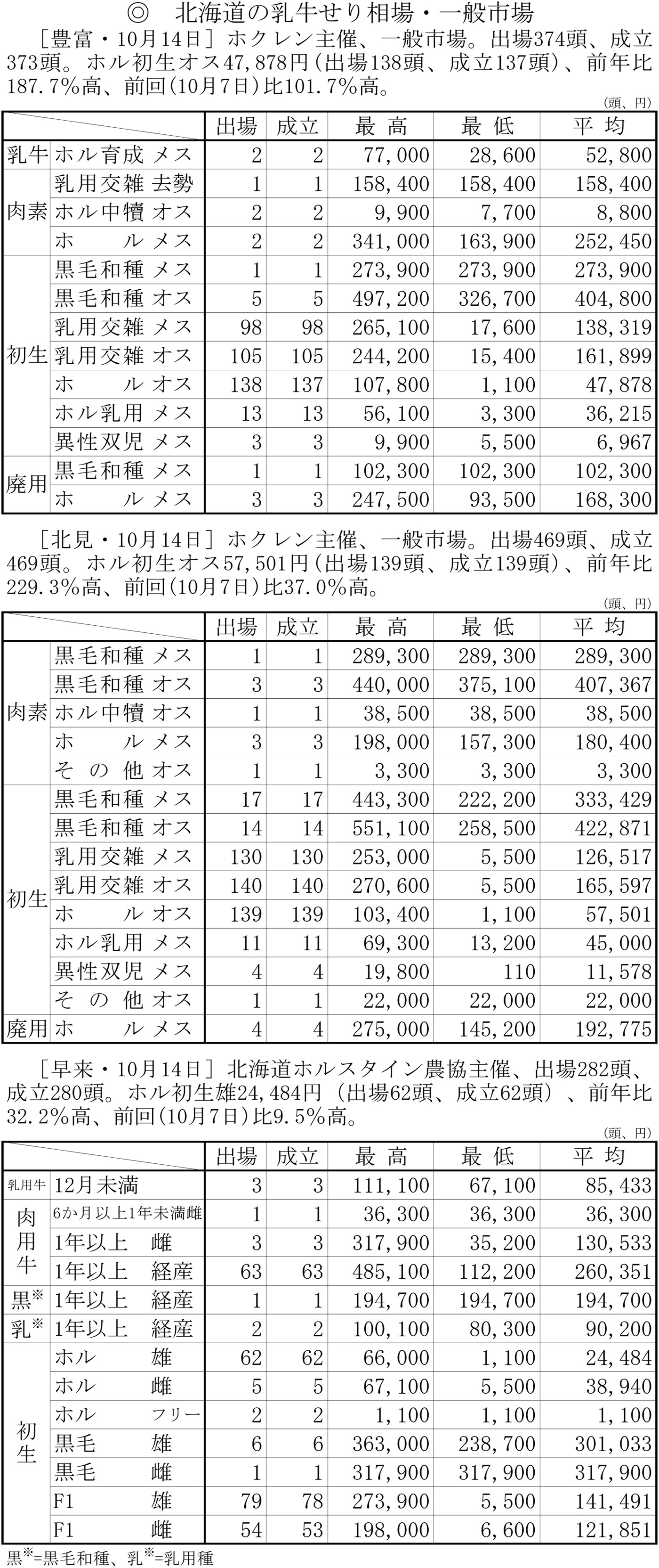 北海道の乳牛せり相場・一般市場(豊富・10月14日、北見・10月14日、早来・10月14日)
