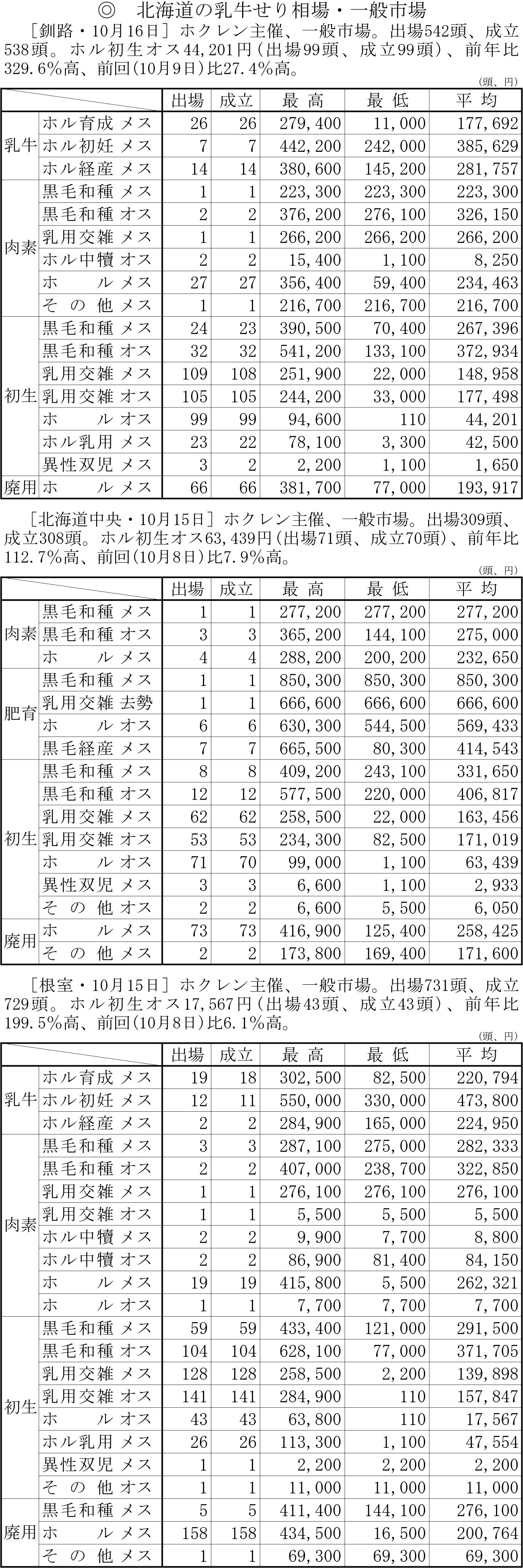 北海道の乳牛せり相場・一般市場(釧路・10月16日、中央・10月15日、根室・10月15日)