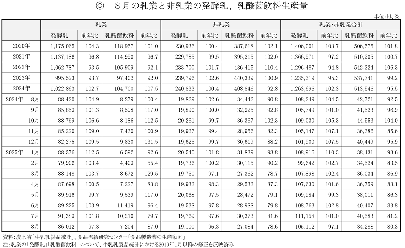 8月の乳業と非乳業の発酵乳、乳酸菌飲料生産量