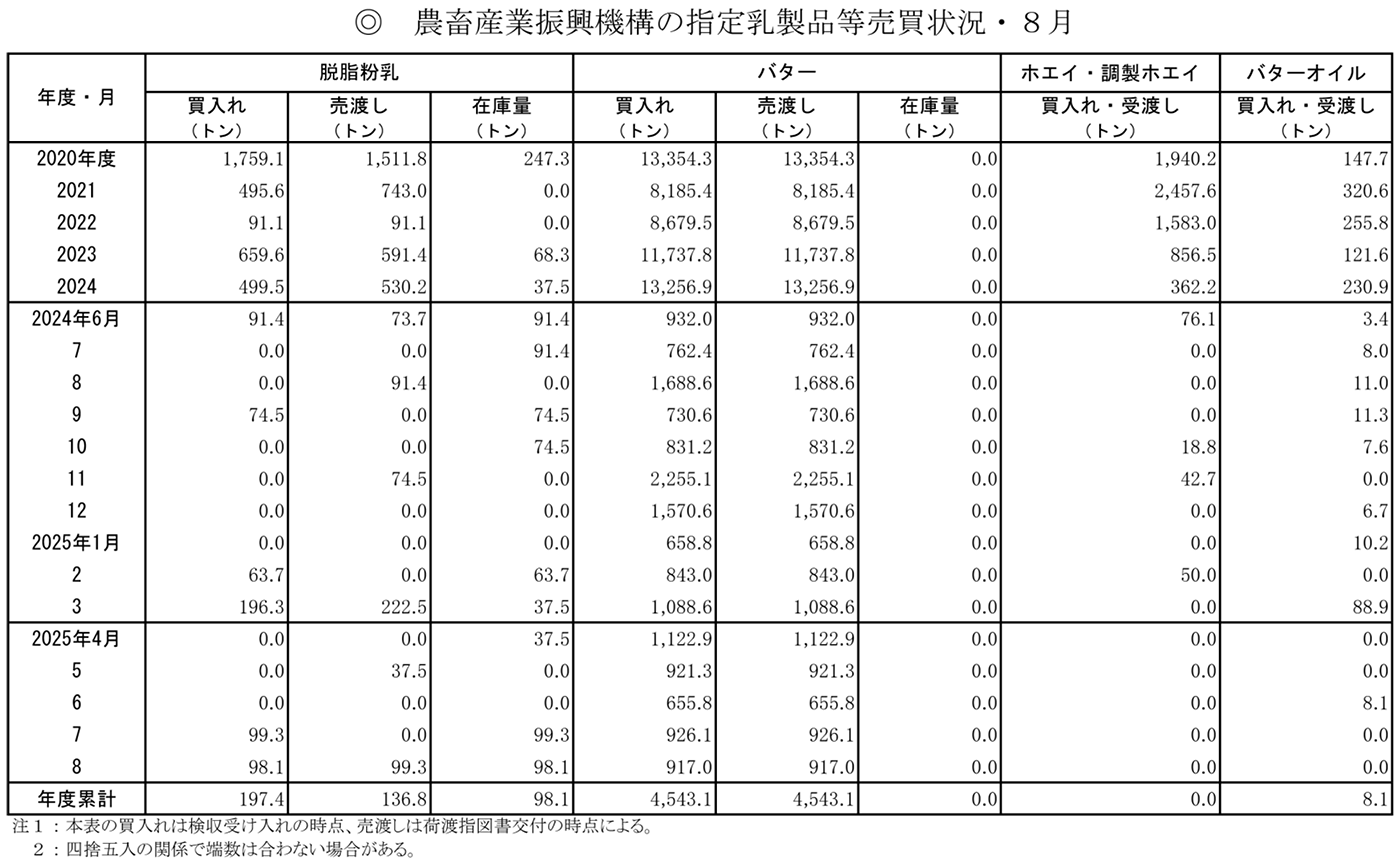 農畜産業振興機構の指定乳製品等売買状況・8月