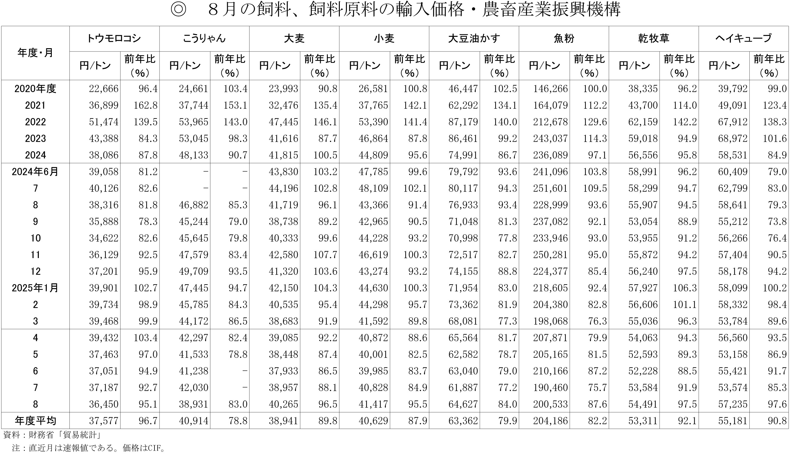 8月の飼料、飼料原料の輸入価格・農畜産業振興機構