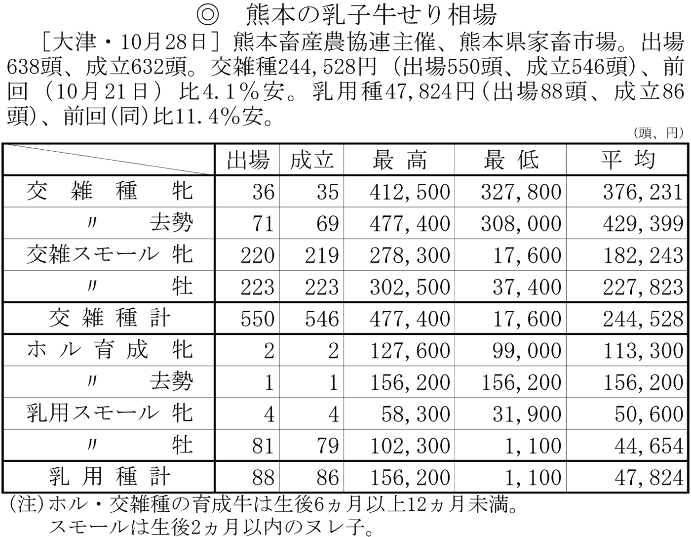 熊本の乳子牛せり相場(大津・10月28日)
