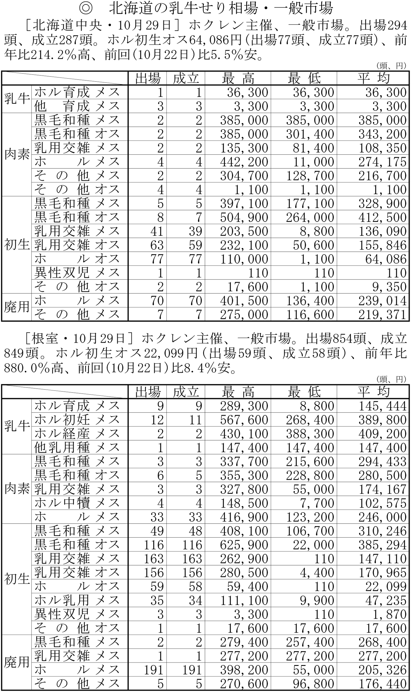 北海道の乳牛せり相場・一般市場(中央・10月29日、根室・10月29日)