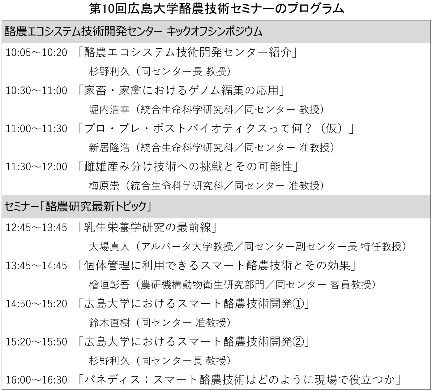 プログラムは〈表〉の通り。午前は「酪農エコシステム技術開発センター キックオフシンポジウム」、午後は「酪農研究最新トピック」として専門家が講演する。「スマート酪農技術はどのように現場で役立つか」と題したパネルディスカッションも行う。