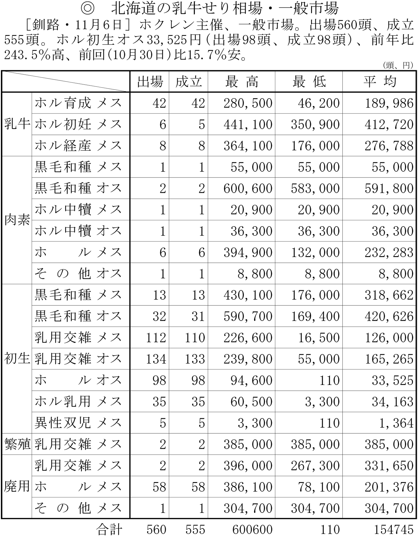 北海道の乳牛せり相場・一般市場(釧路・11月6日)