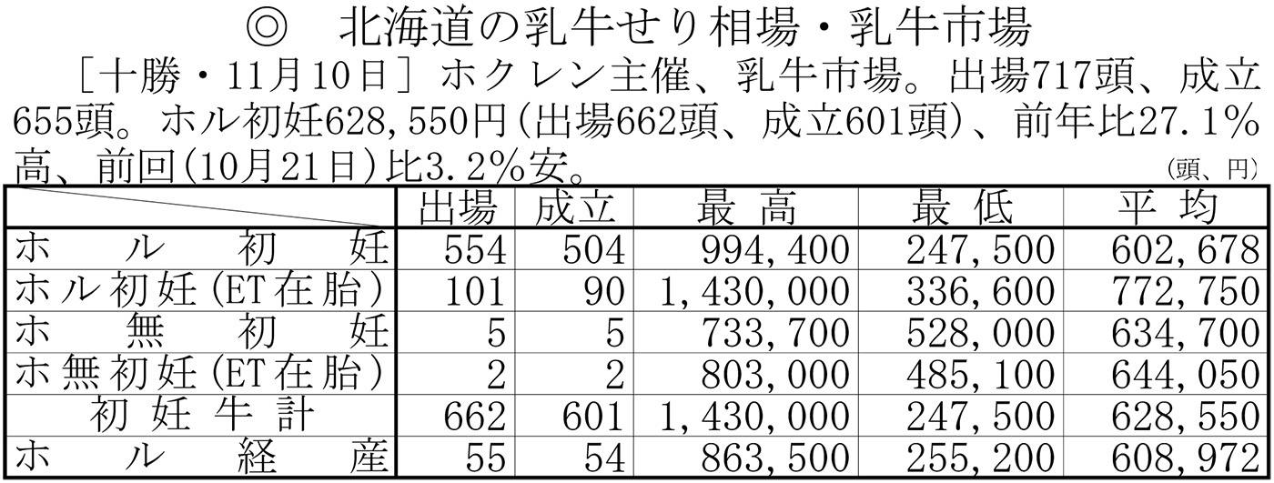 北海道の乳牛せり相場・乳牛市場(十勝・11月10日)
