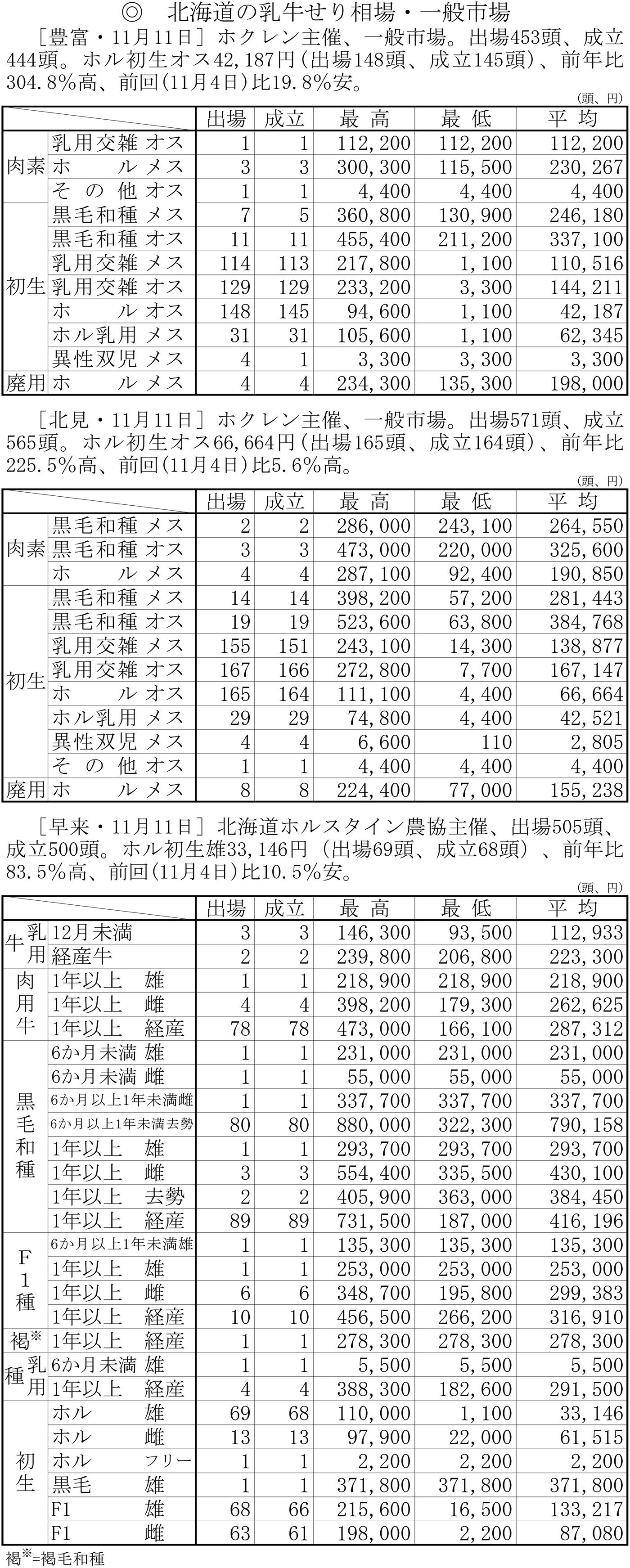 北海道の乳牛せり相場・一般市場(豊富・11月11日、北見・11月11日、早来・11月11日)