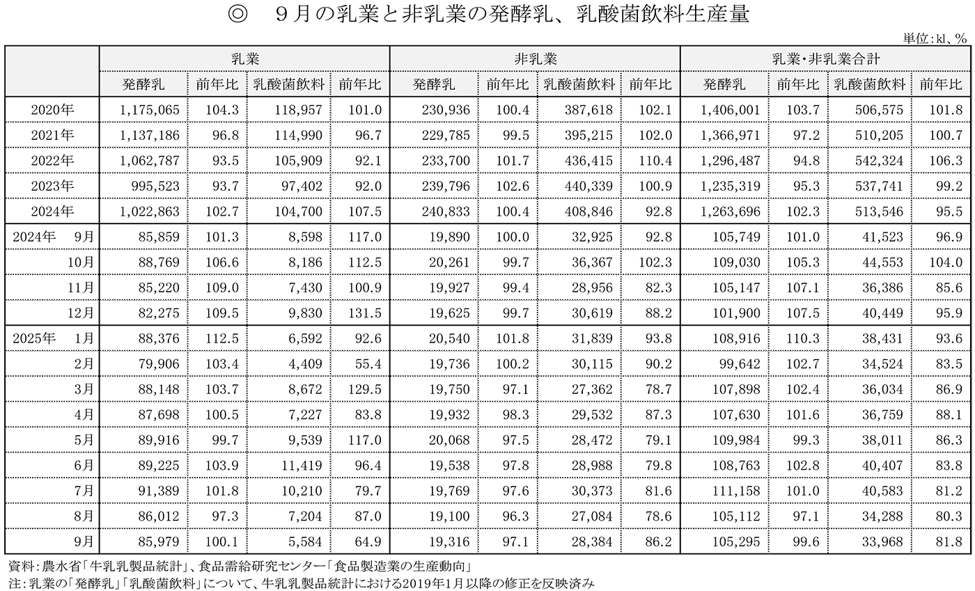 9月の乳業と非乳業の発酵乳、乳酸菌飲料生産量