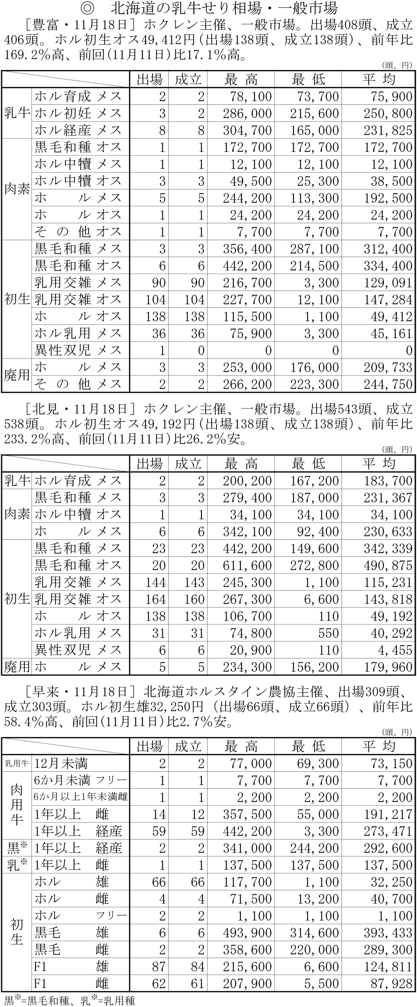 北海道の乳牛せり相場・一般市場(豊富・11月18日、北見・11月18日、早来・11月18日)