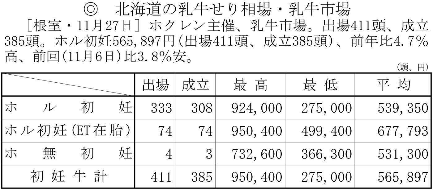 北海道の乳牛せり相場・乳牛市場(根室・11月27日)