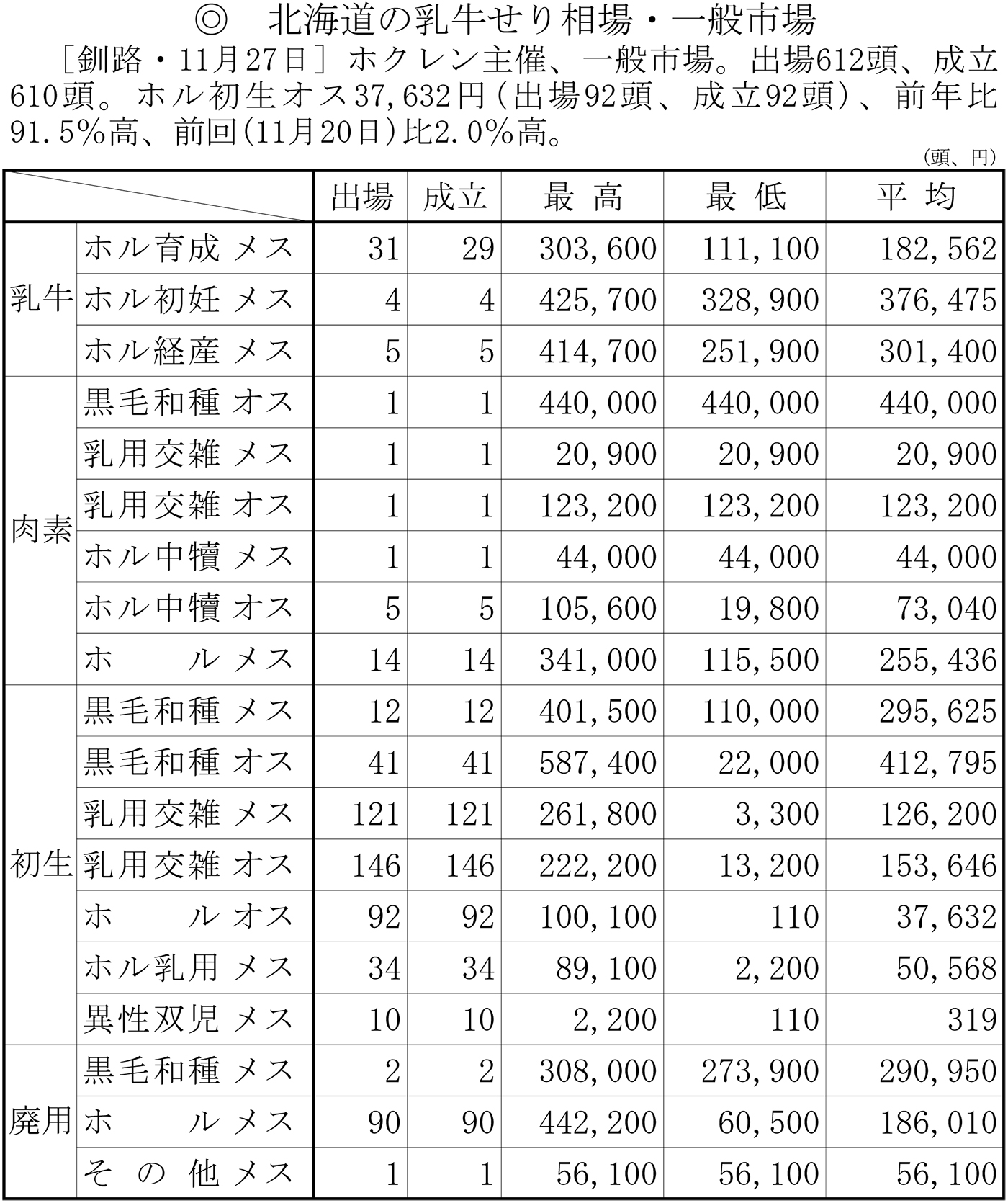 北海道の乳牛せり相場・一般市場(釧路・11月27日)