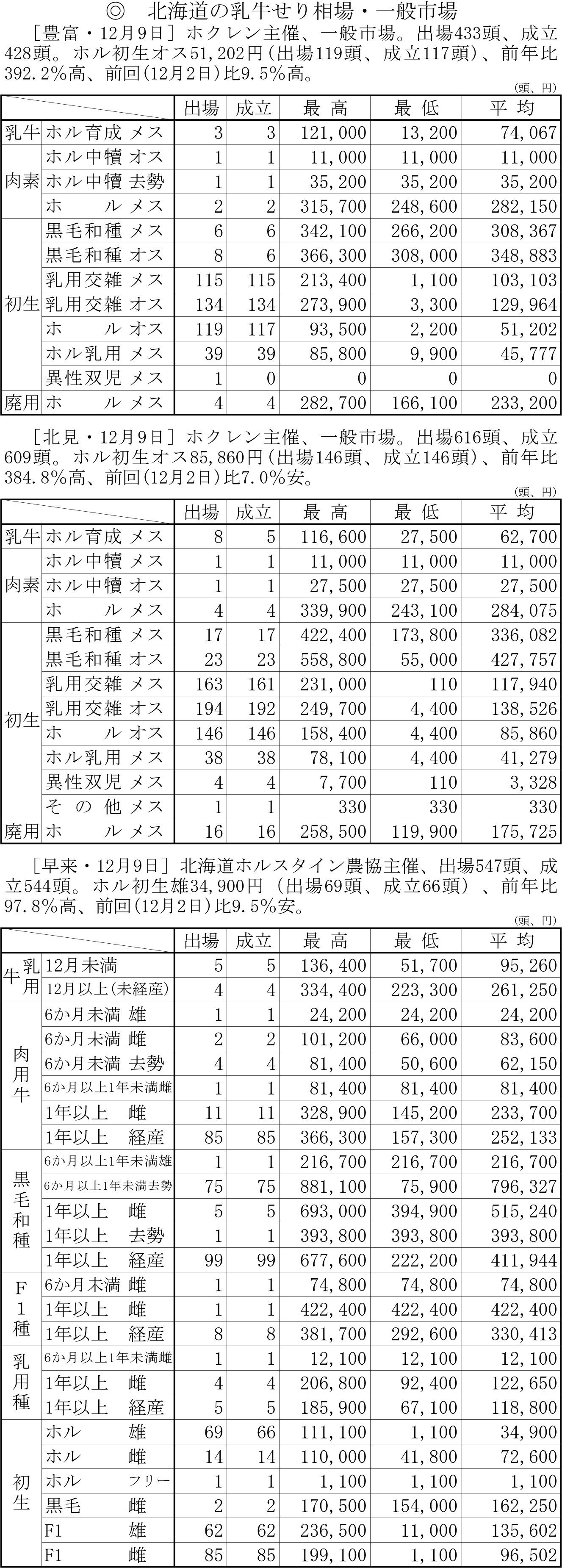 北海道の乳牛せり相場・一般市場(豊富・12月9日、北見・12月9日、早来・12月9日)