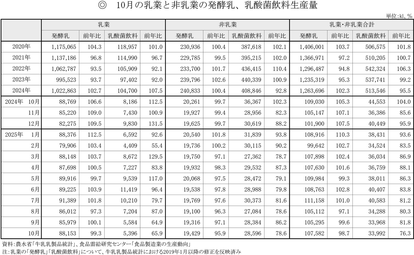 10月の乳業と非乳業の発酵乳、乳酸菌飲料生産量