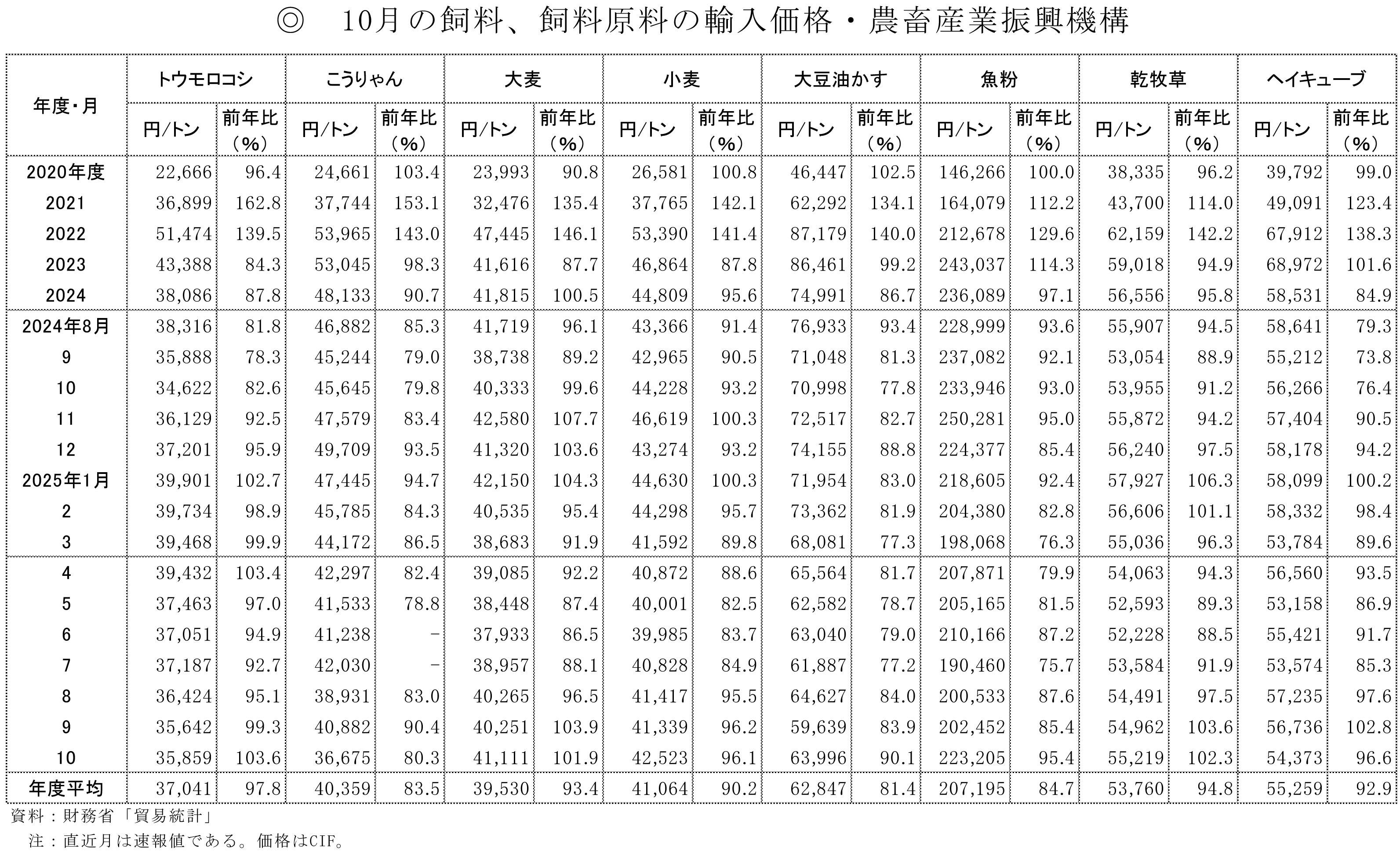 10月の飼料、飼料原料の輸入価格・農畜産業振興機構