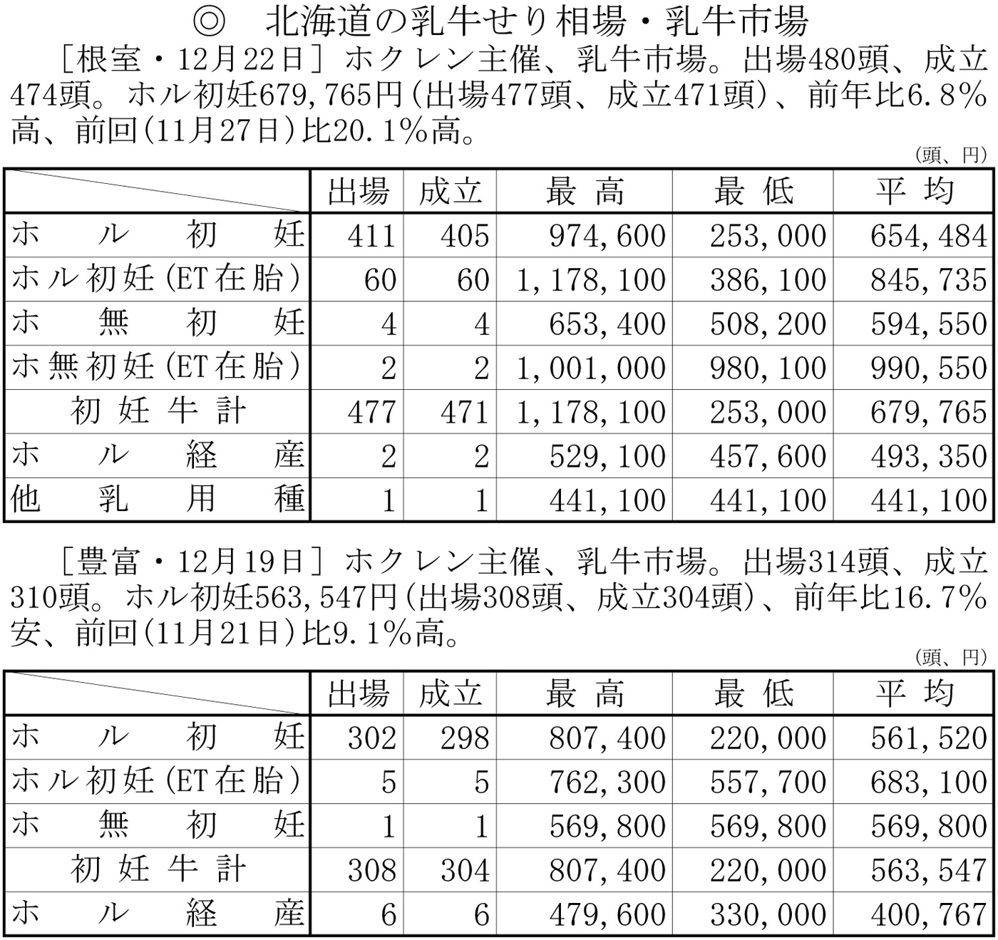 北海道の乳牛せり相場・乳牛市場(根室・12月22日、豊富・12月19日)