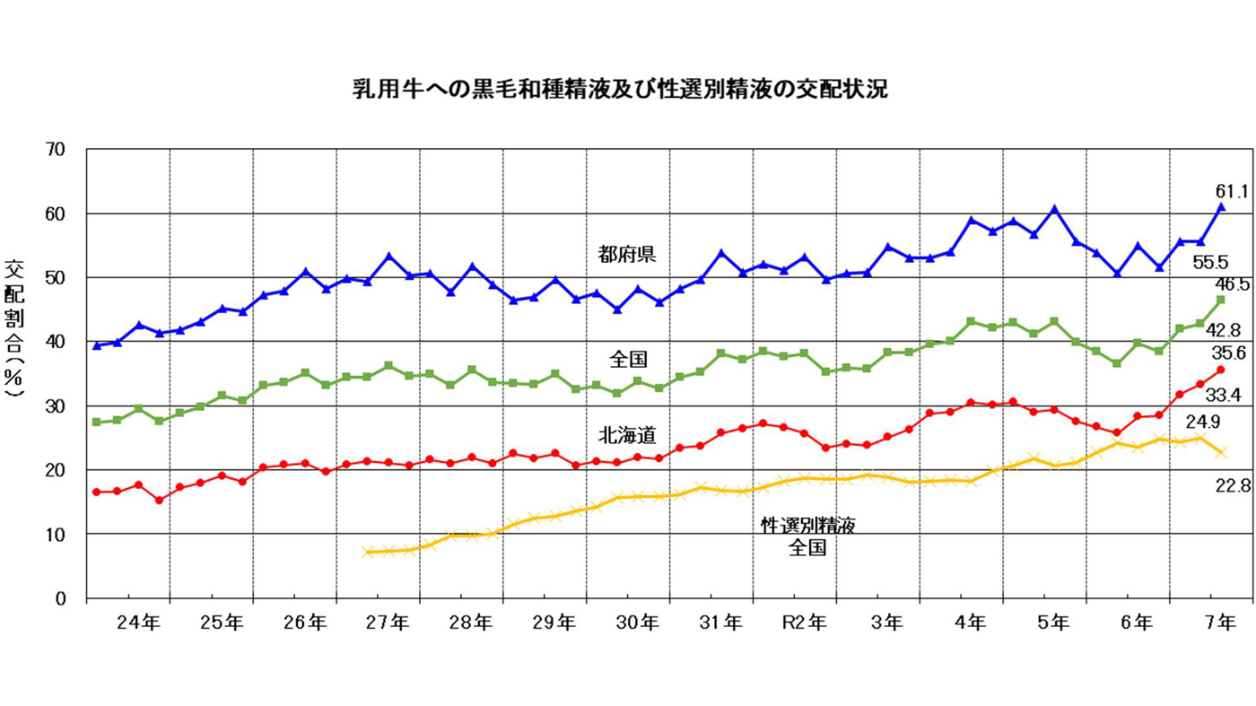 日本家畜人工授精師協会が23日までにまとめた2025年第3四半期(7~9月期)の乳用牛への黒毛和種の交配割合(F1種付け率)は、前期比3.7㌽増(前年比6.7㌽増)の46.5%となり過去最高を更新した。F1初生牛相場の上昇が大きいとみられる。 北海道は前期比2.2㌽増(前年比7.3㌽増)の35.6%...