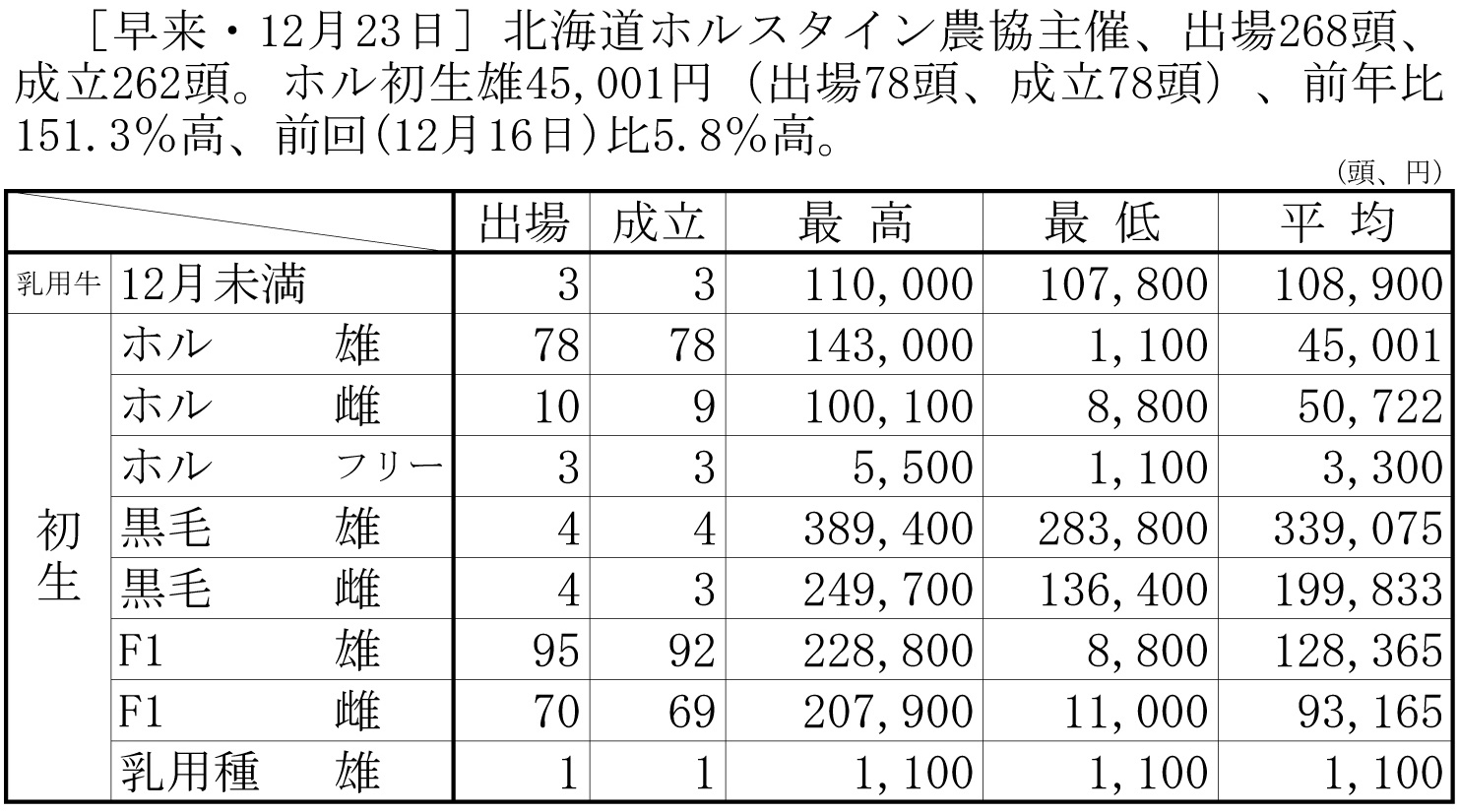 北海道の乳牛せり相場・一般市場(早来・12月23日)