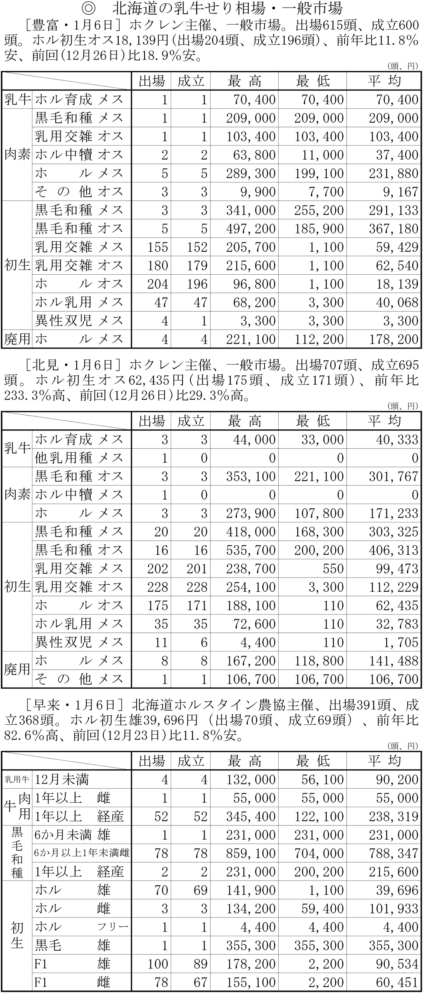 北海道の乳牛せり相場・一般市場(豊富・1月6日、北見・1月6日、早来・1月6日)
