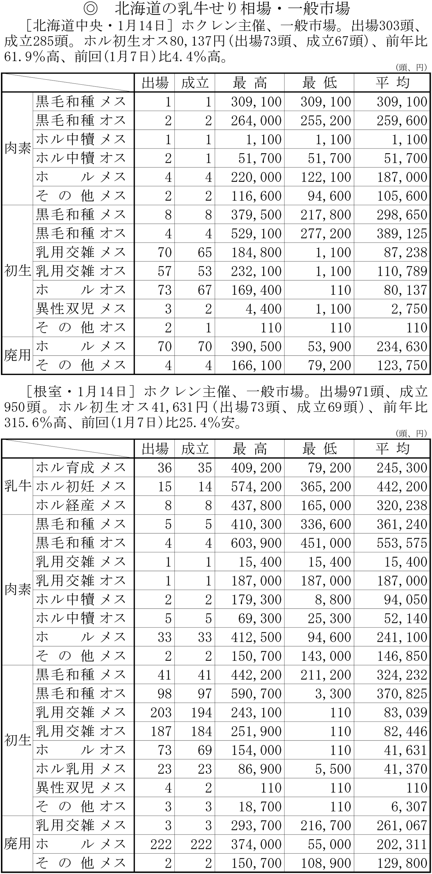 北海道の乳牛せり相場・一般市場(中央・1月14日、根室・1月14日)