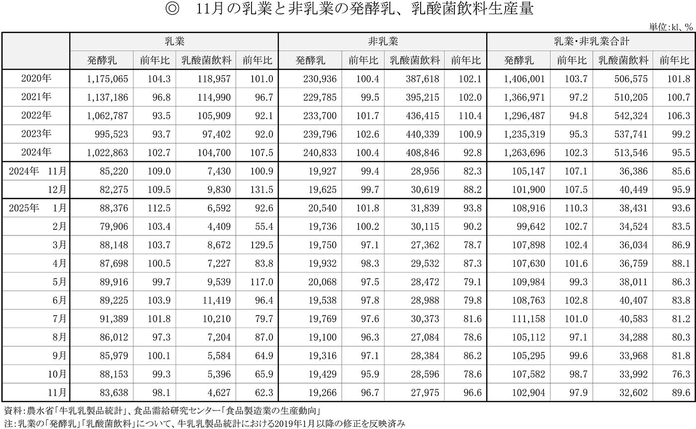 11月の乳業と非乳業の発酵乳、乳酸菌飲料生産量