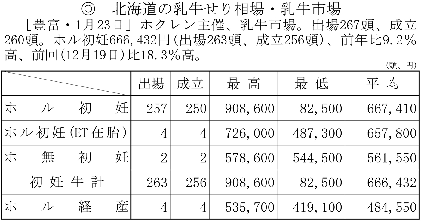 北海道の乳牛せり相場・乳牛市場(豊富・1月23日)