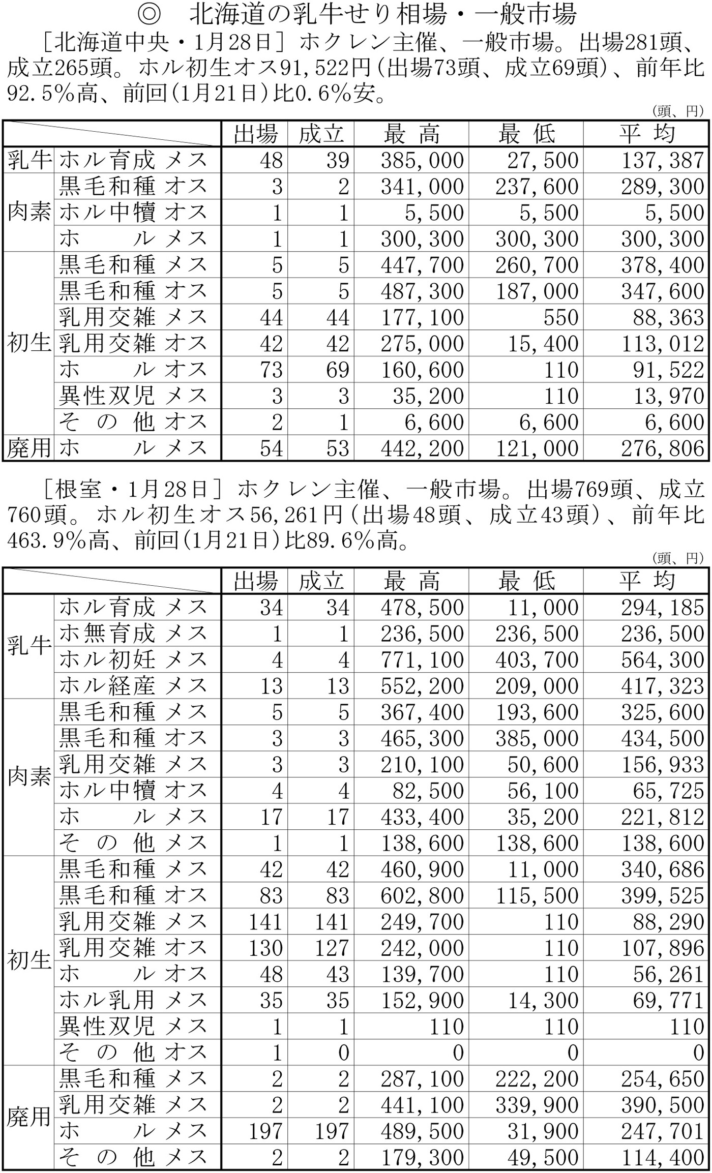 北海道の乳牛せり相場・一般市場(中央・1月28日、根室・1月28日)