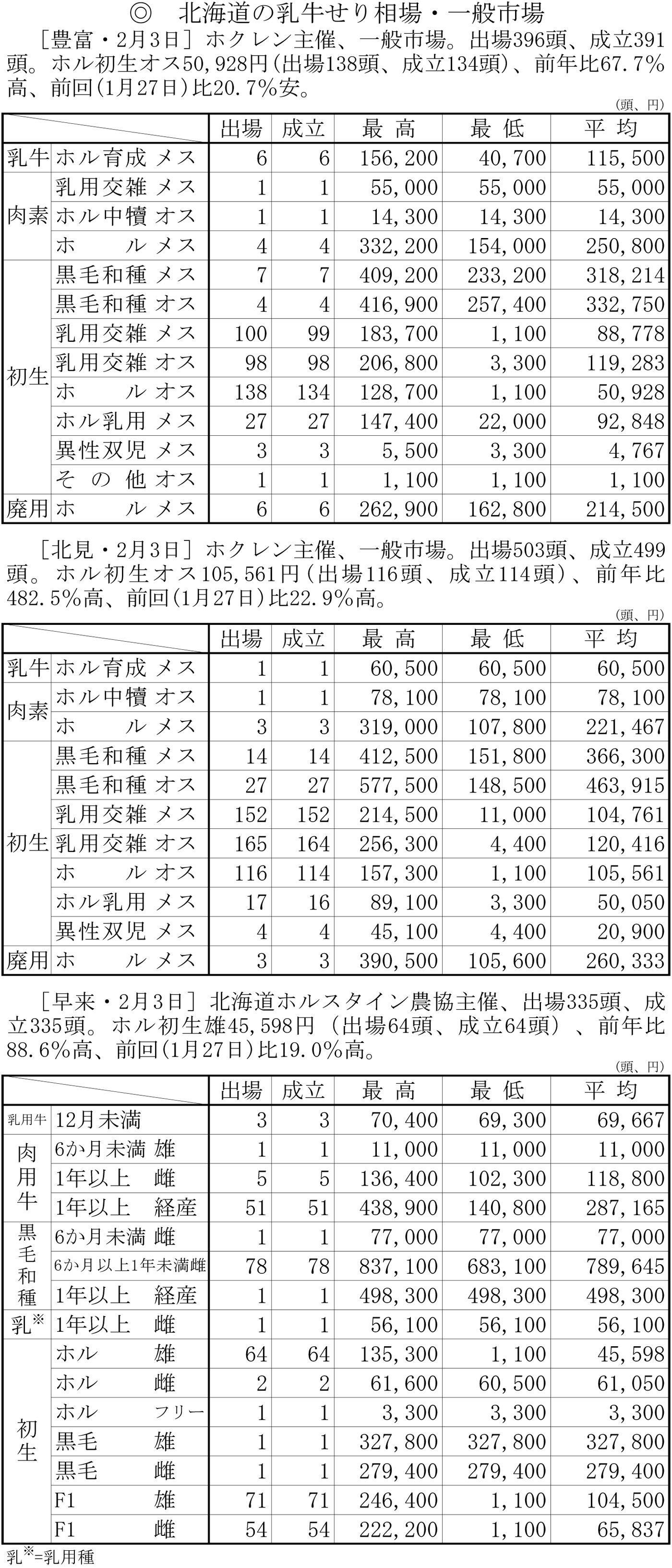 北海道の乳牛せり相場・一般市場(豊富・2月3日、北見・2月3日、早来・2月3日)