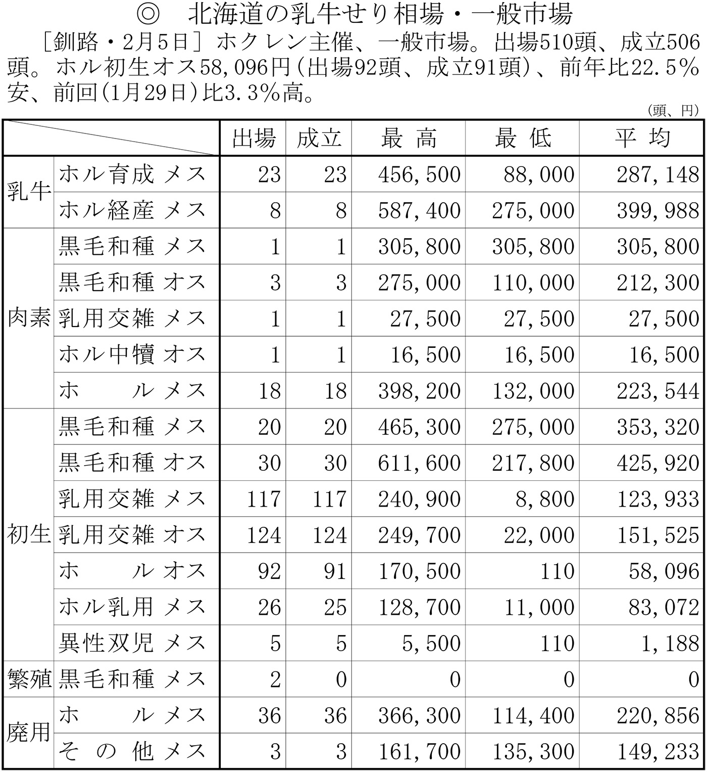 北海道の乳牛せり相場・一般市場(釧路・2月5日)