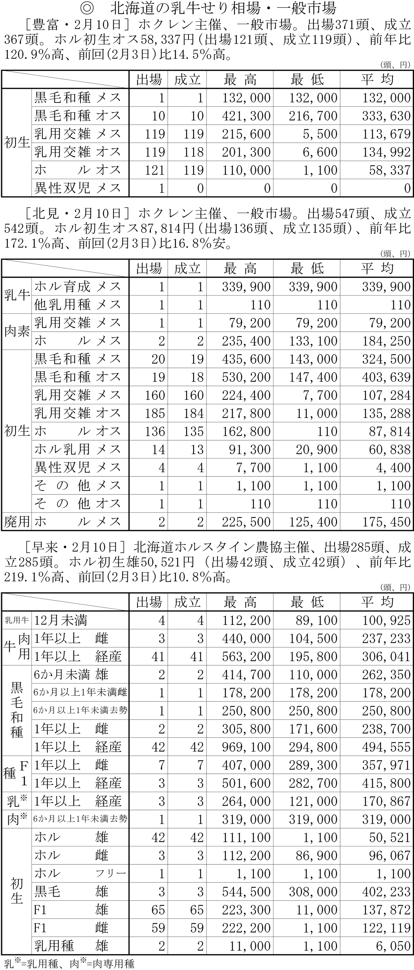 北海道の乳牛せり相場・一般市場(豊富・2月10日、北見・2月10日、早来・2月10日)