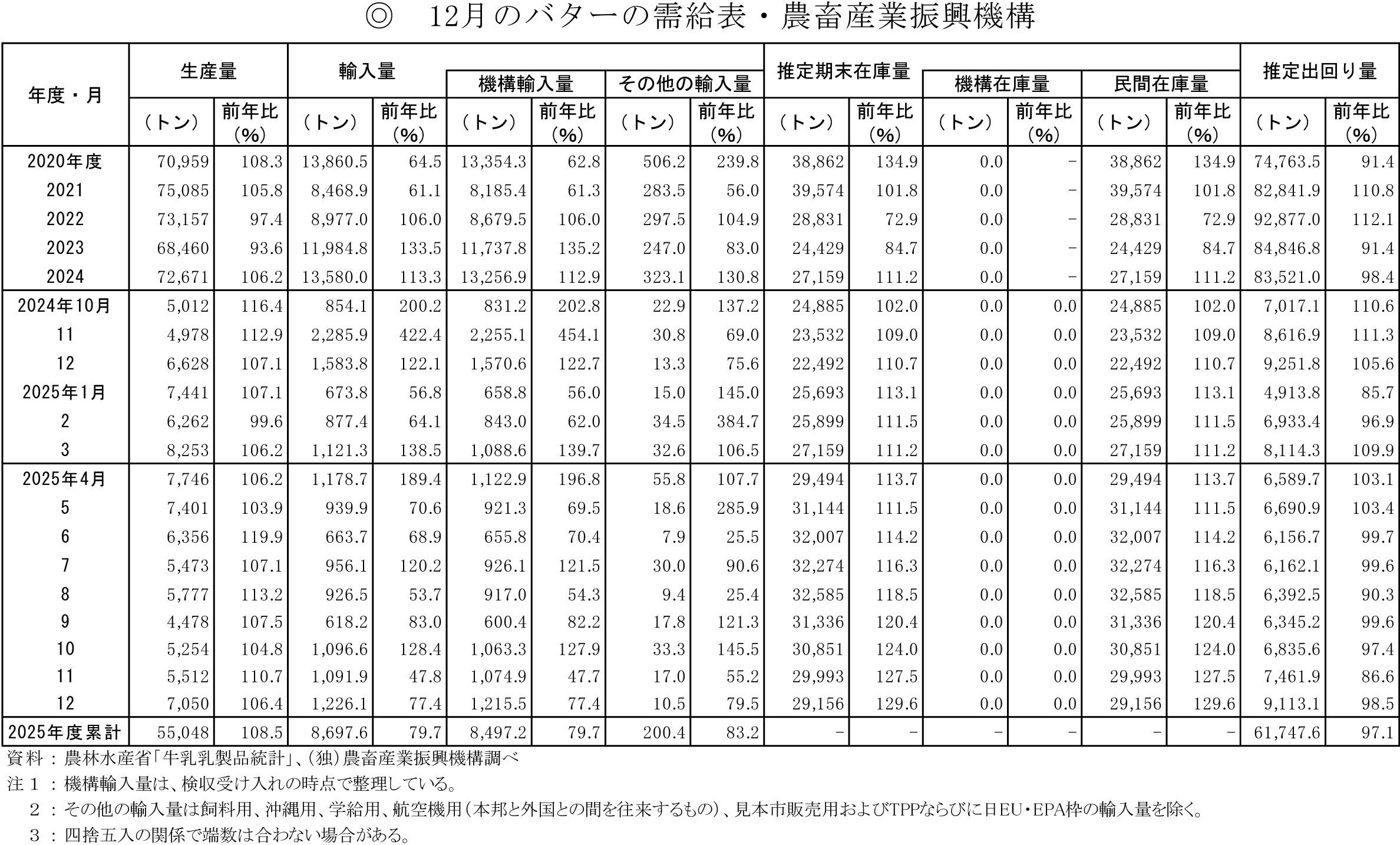 12月のバターの需給表・農畜産業振興機構