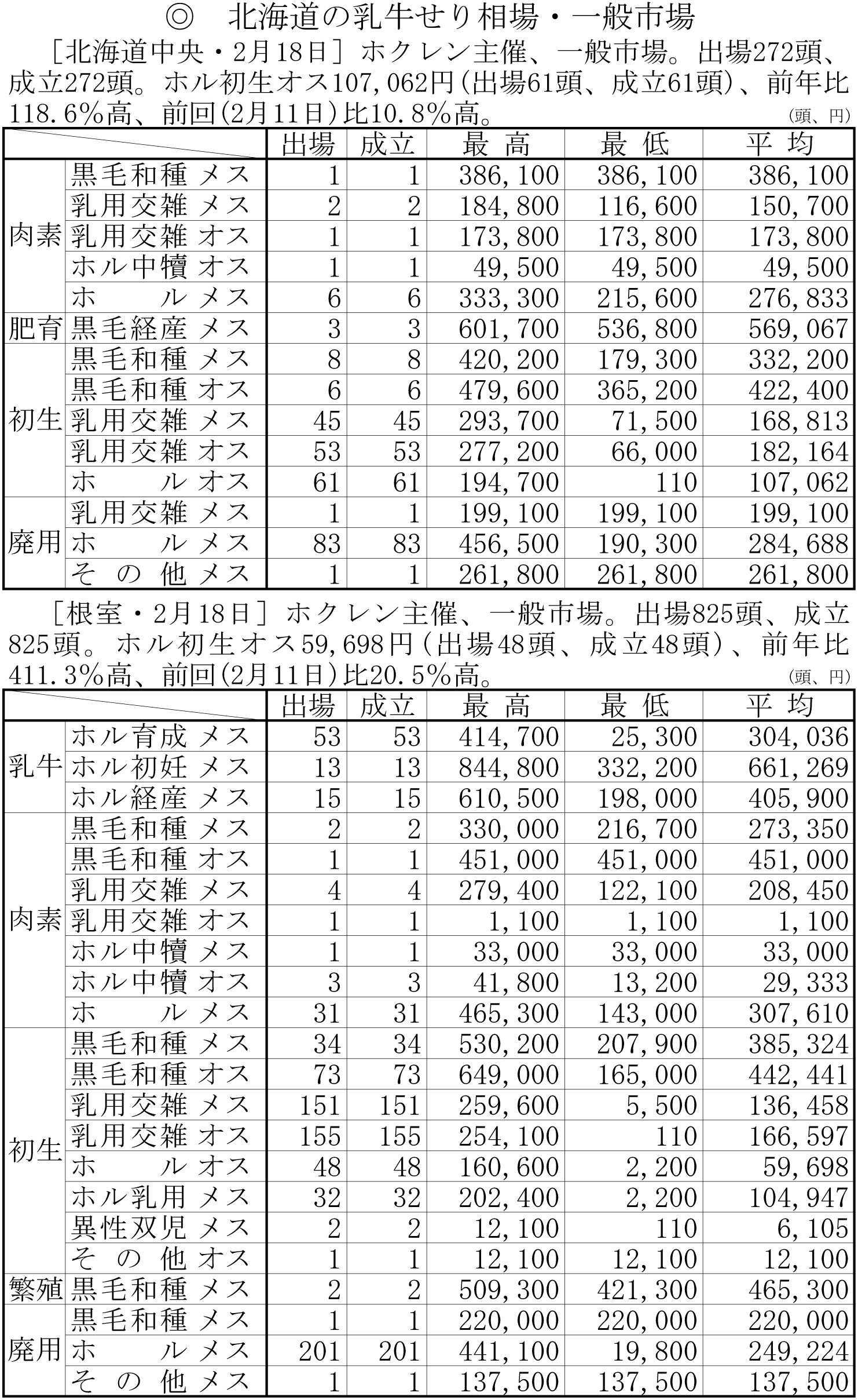 北海道の乳牛せり相場・一般市場(中央・2月18日、根室・2月18日)