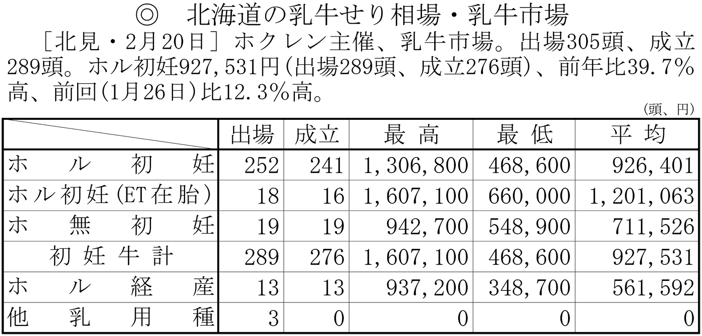 北海道の乳牛せり相場・乳牛市場(北見・2月20日)