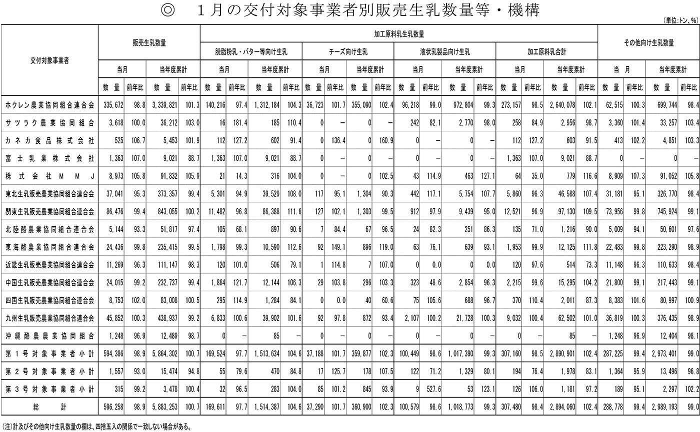 1月の交付対象事業者別販売生乳数量等・機構