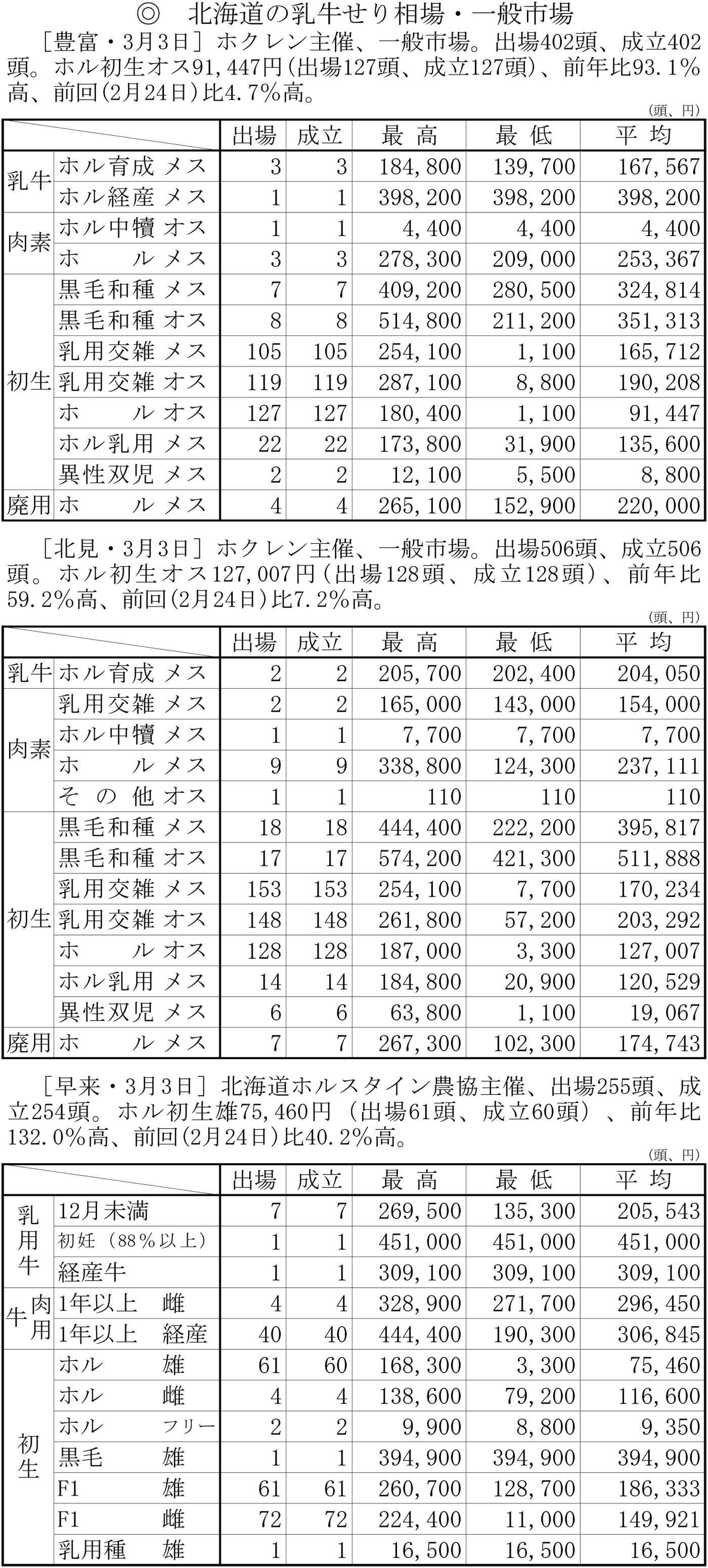 北海道の乳牛せり相場・一般市場(豊富・3月3日、北見・3月3日、早来・3月3日)