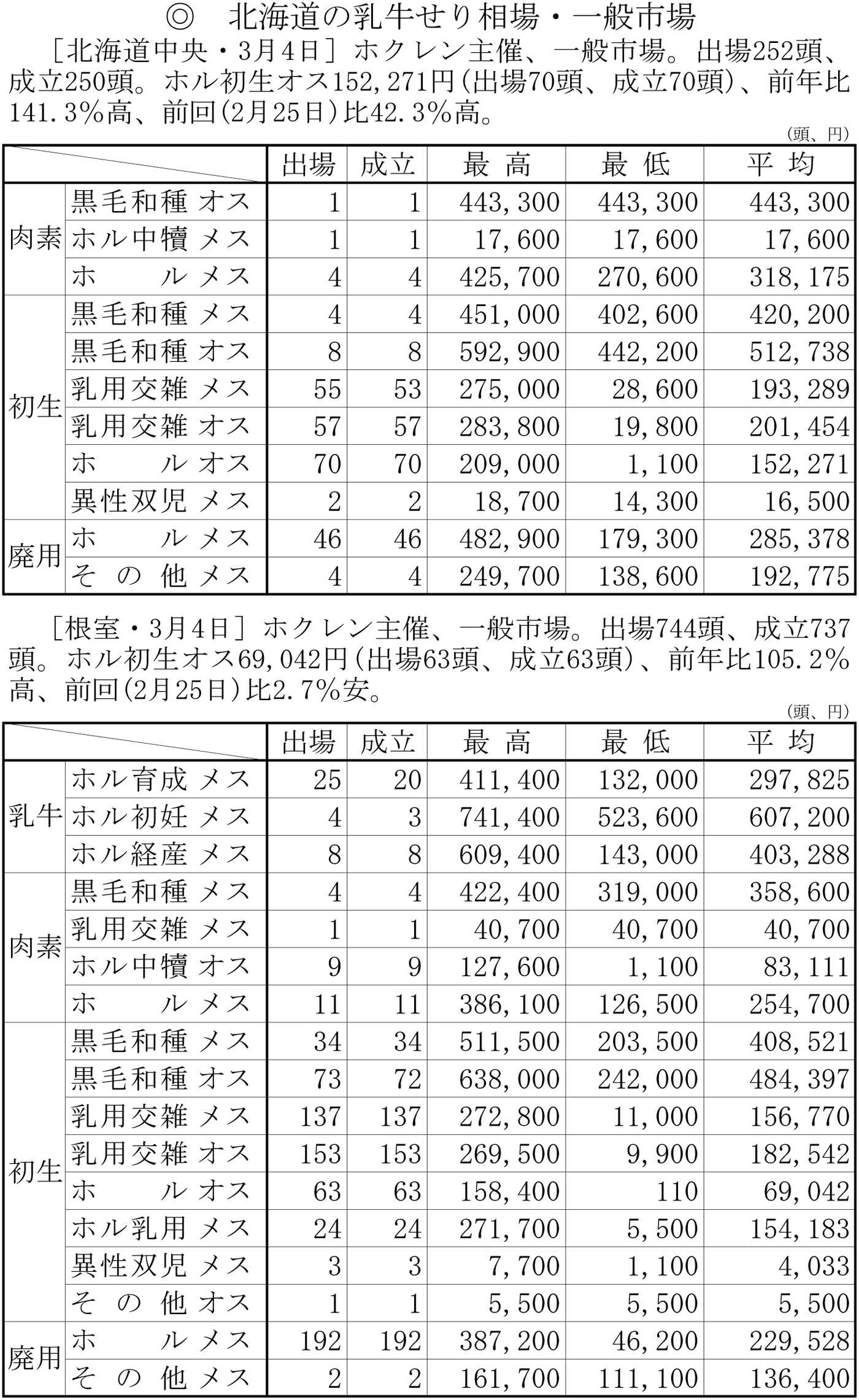 北海道の乳牛せり相場・一般市場(中央・3月4日、根室・3月4日)