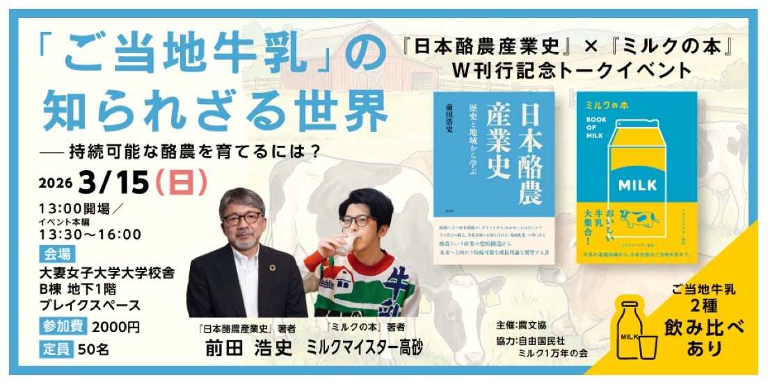 農山漁村文化協会(農文協)は15日、東京・三番町の大妻女子大学で「『ご当地牛乳』の知られざる世界~持続可能な酪農を育てるには?~」と題するイベントを開く。「日本酪農産業史」(農文協)と「ミルクの本」(自由国民社)の出版を記念し、各著者の前田浩史氏とミルクマイスターⓇ高砂氏がトークを繰り広げる。