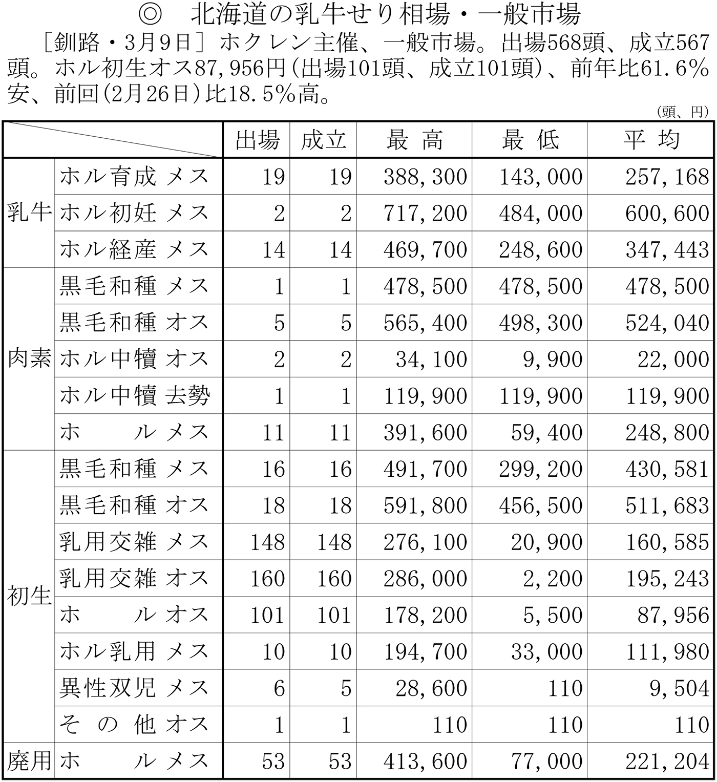 北海道の乳牛せり相場・一般市場(釧路・3月9日)