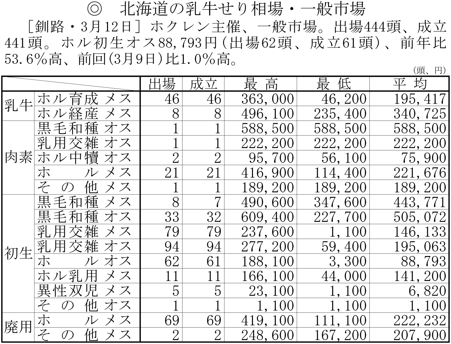 北海道の乳牛せり相場・一般市場(釧路・3月12日)