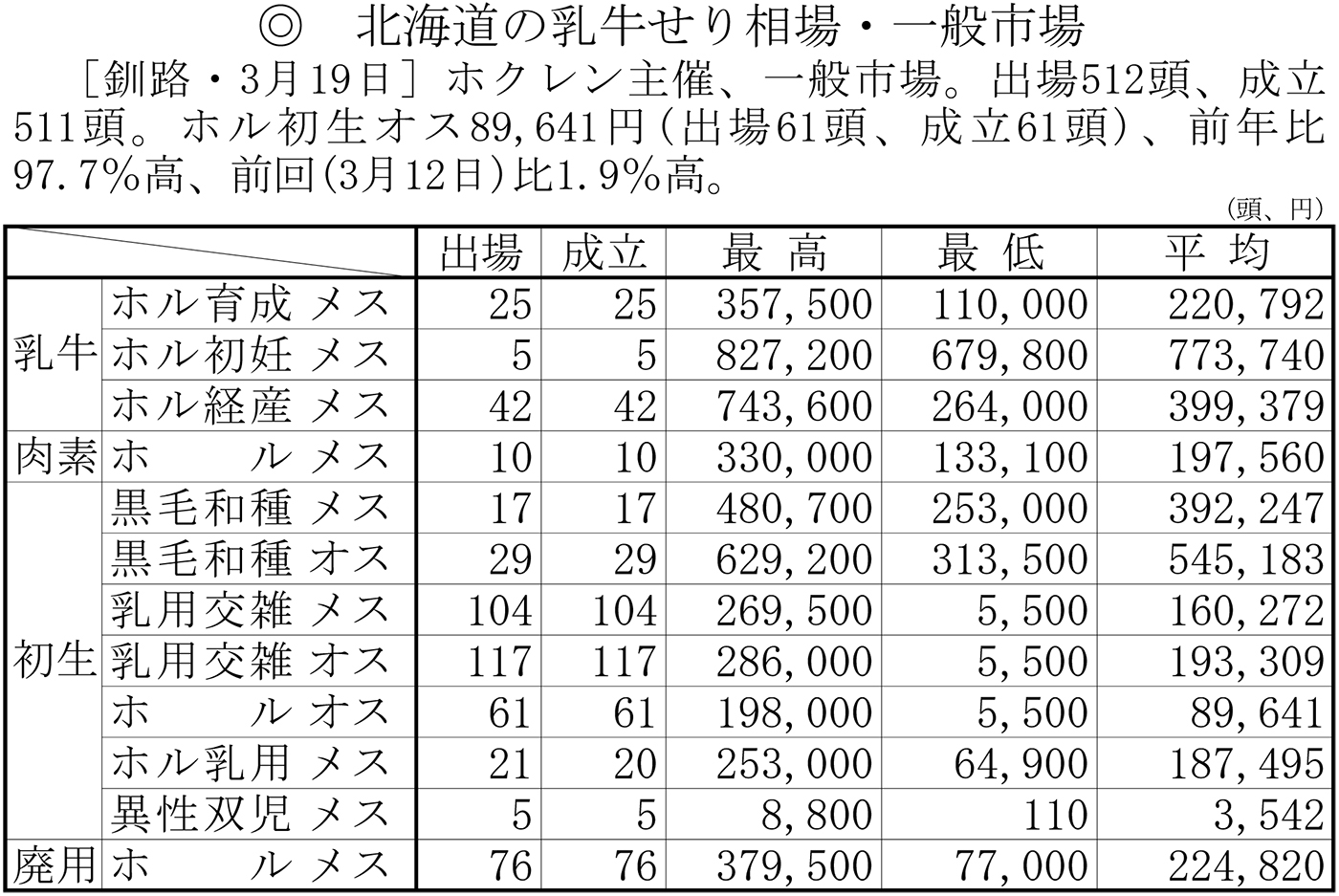 北海道の乳牛せり相場・一般市場(釧路・3月19日)