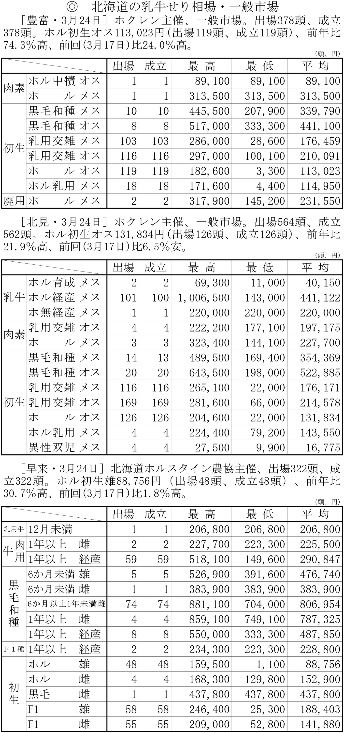 北海道の乳牛せり相場・一般市場(豊富・3月24日、北見・3月24日、早来・3月24日)