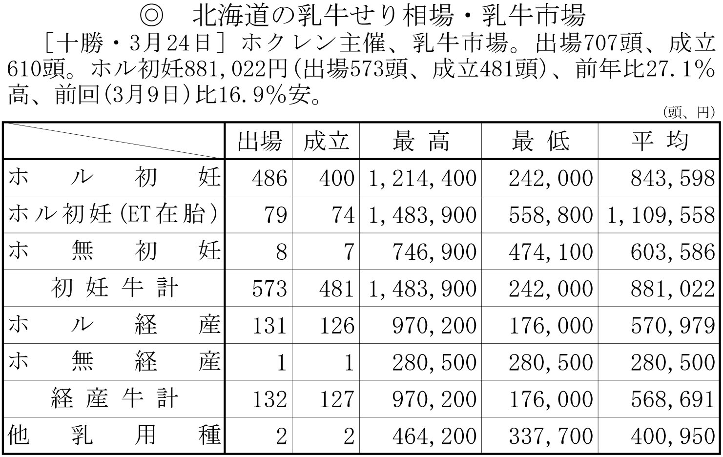 北海道の乳牛せり相場・乳牛市場(十勝・3月24日)