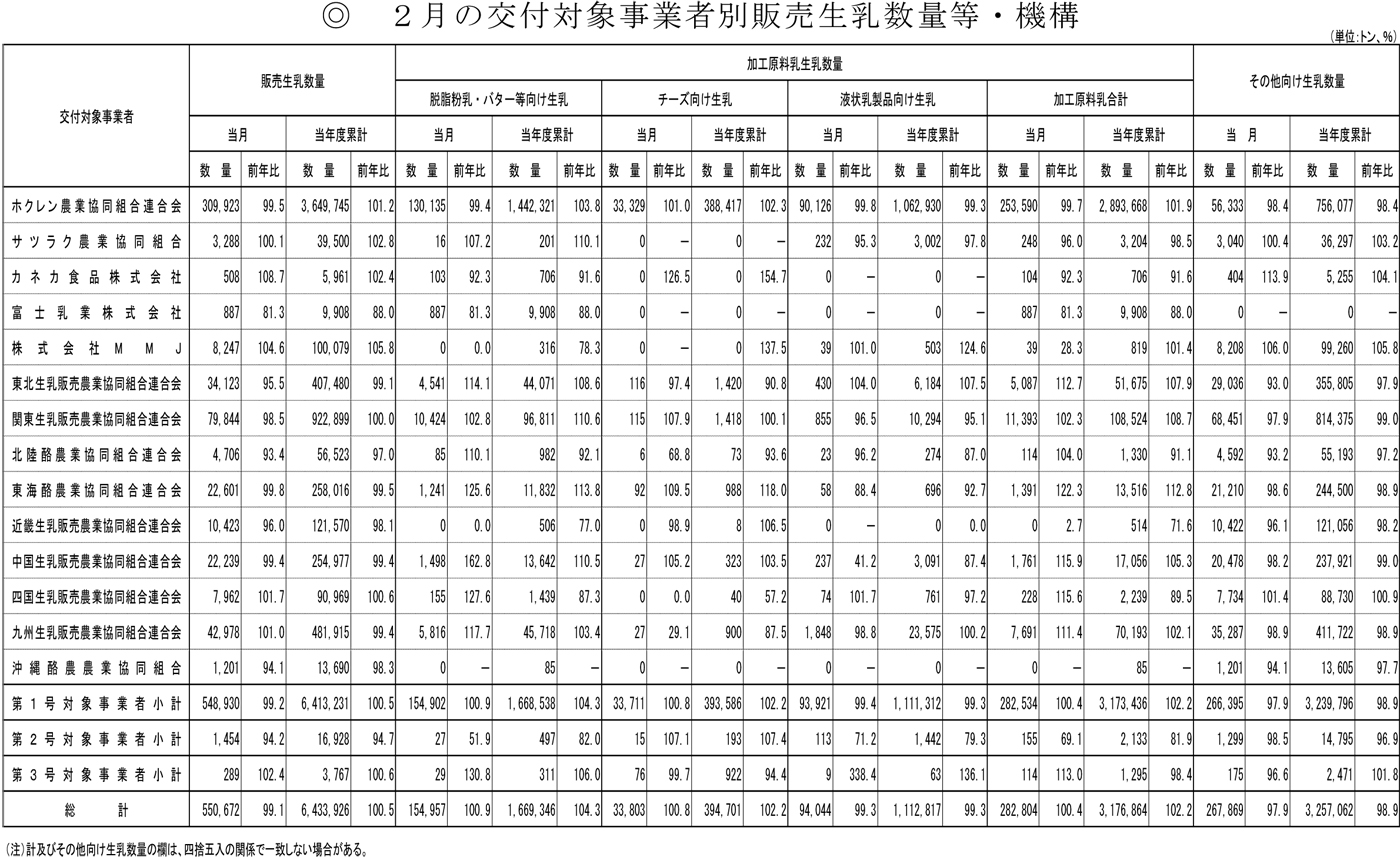 2月の交付対象事業者別販売生乳数量等・機構
